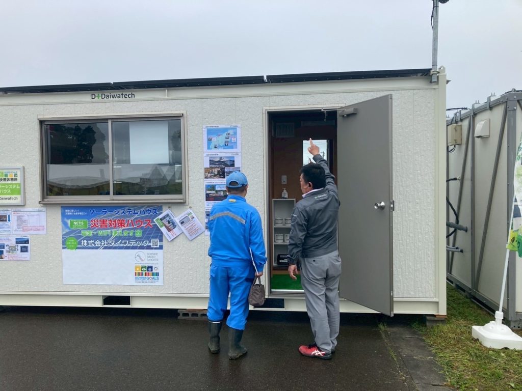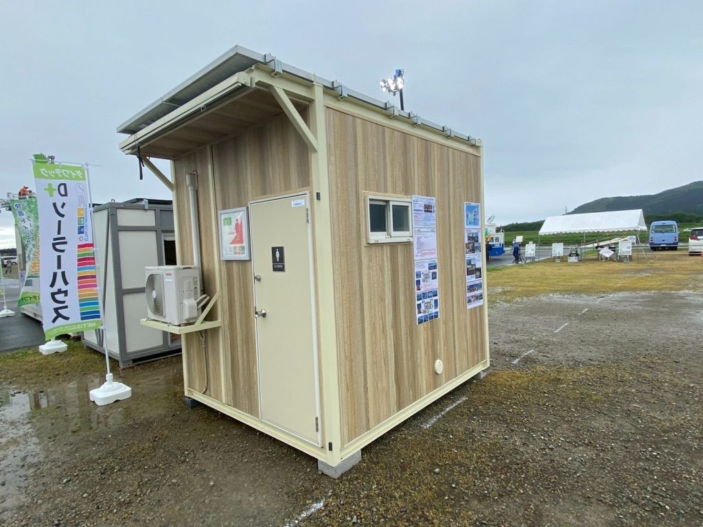 また、今回は展示参加以外でも、水洗トイレ付きソーラーシステムハウス(くつろぎ、活用促進技術認定)を運営補助会社(パナックス・ジャパン)様に来賓者用トイレ・救護所として水防演習運営に使用していただきました。