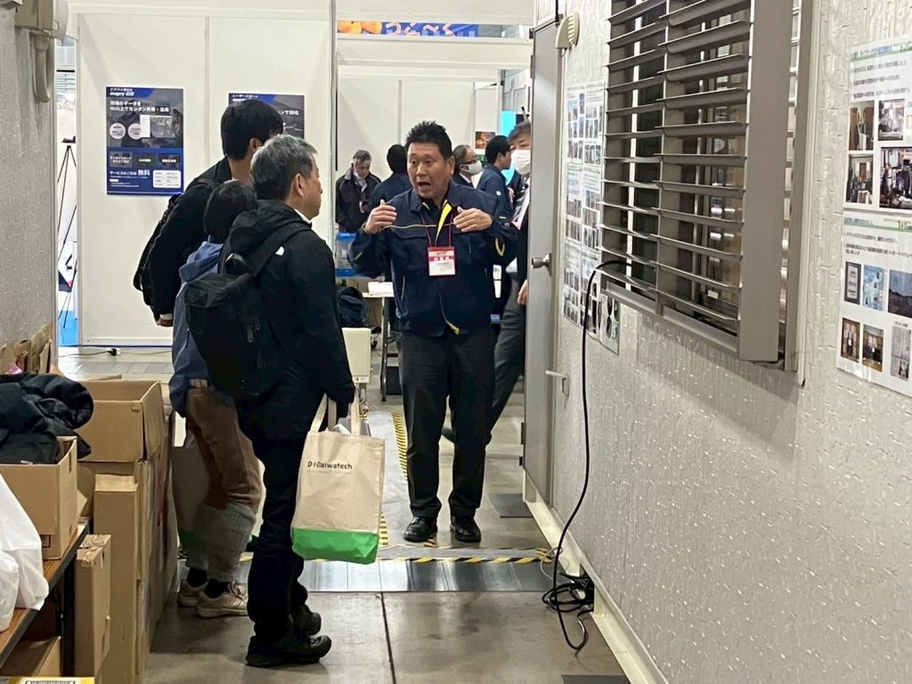 ソーラーシステム製品を使用した遠隔操作による無人重機操作の実証実験や、実際に本工事で取り入れた実例(ICT関係)をご紹介、普段の工事での使用が災害対策になるというコンセプトをご案内しました。
