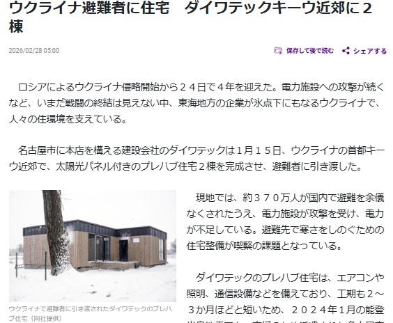 ロシアによるウクライナ侵略の開始から、4年が経とうとしており、東海地方に関わる企業がどのような形で復興に向けて尽力しているかということについて、取材していただいた内容を掲載いただいております。